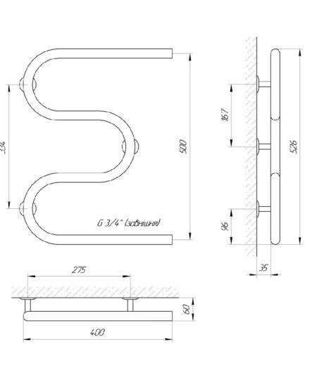 Водяна рушникосушка Laris Змійовик 25РС3 400 x 500 3/4″