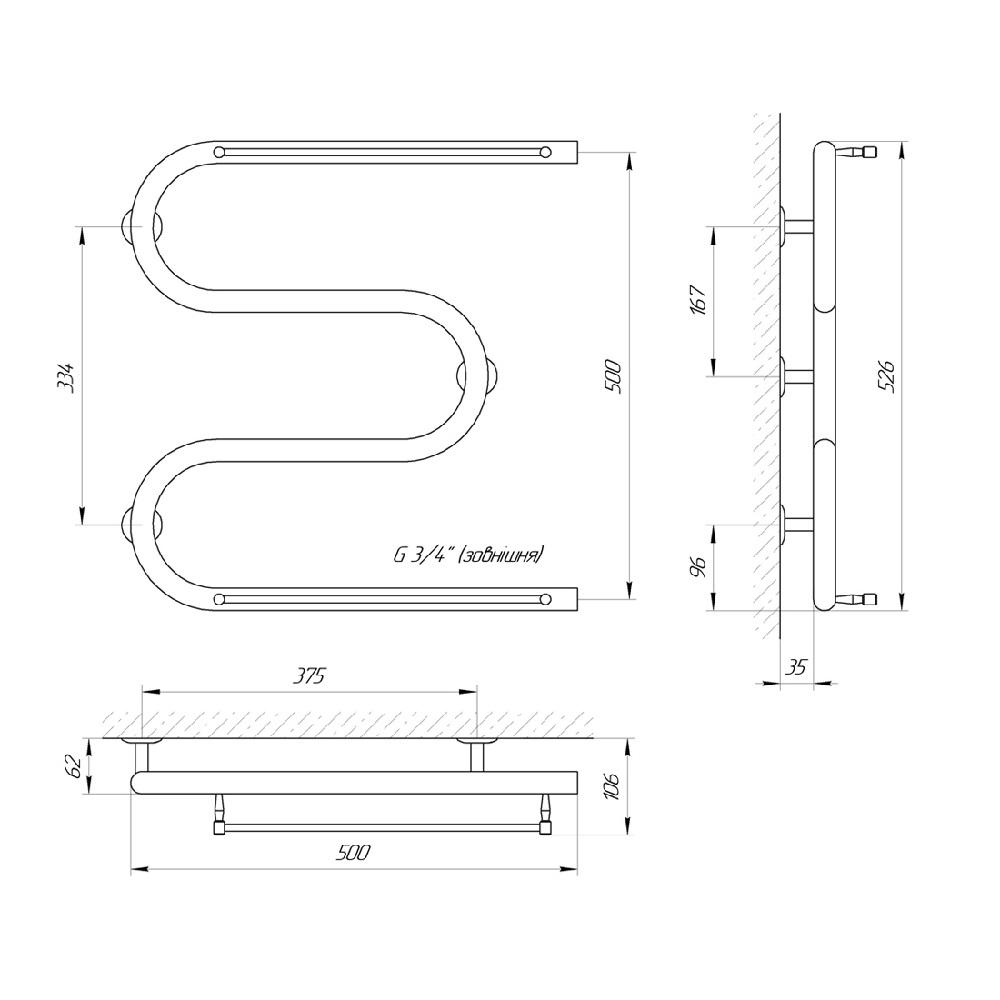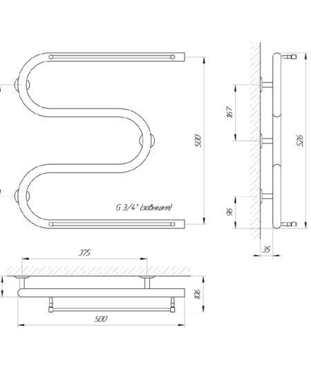 Водяна рушникосушка Laris Змійовик 25РС3 500 х 500 3/4″ з поличками